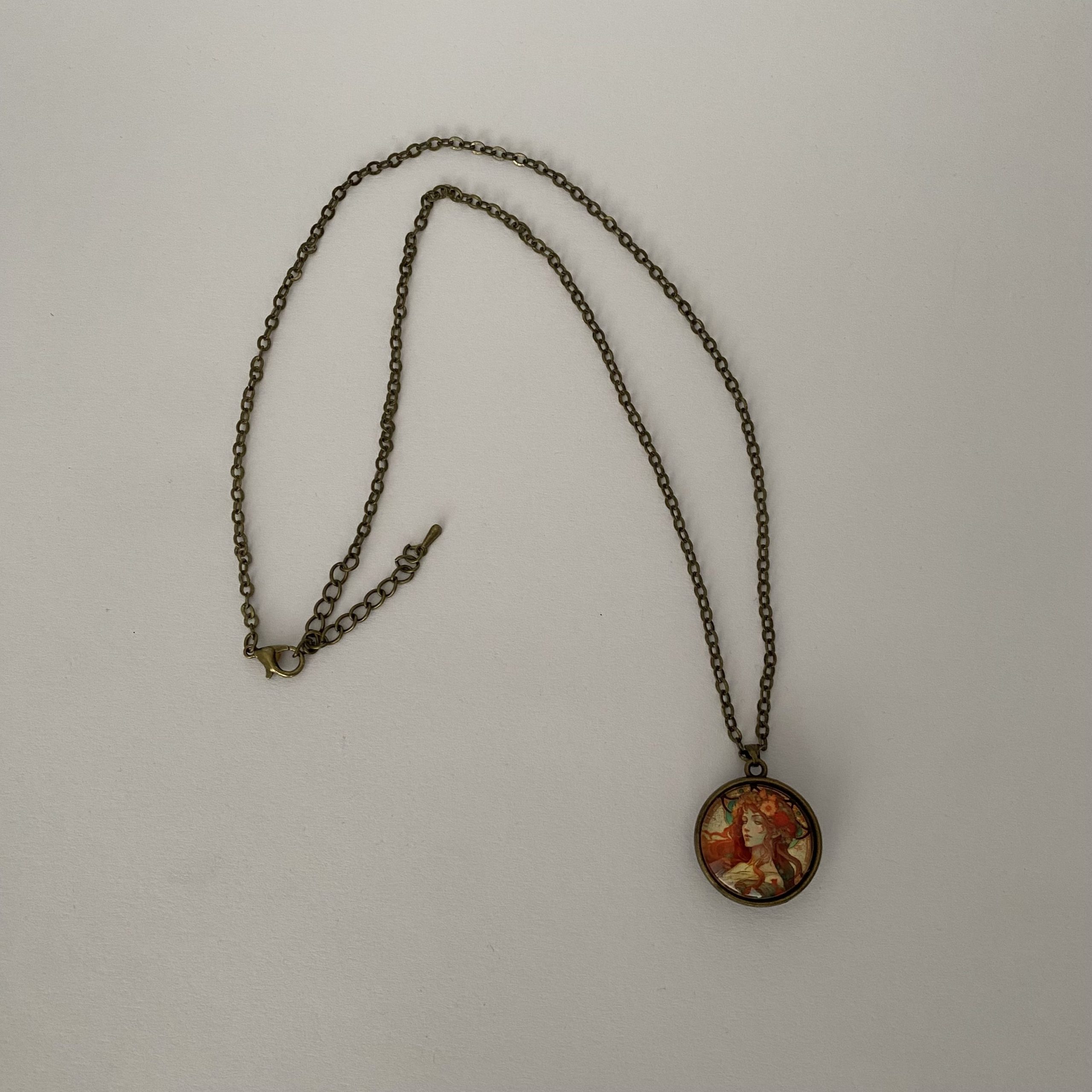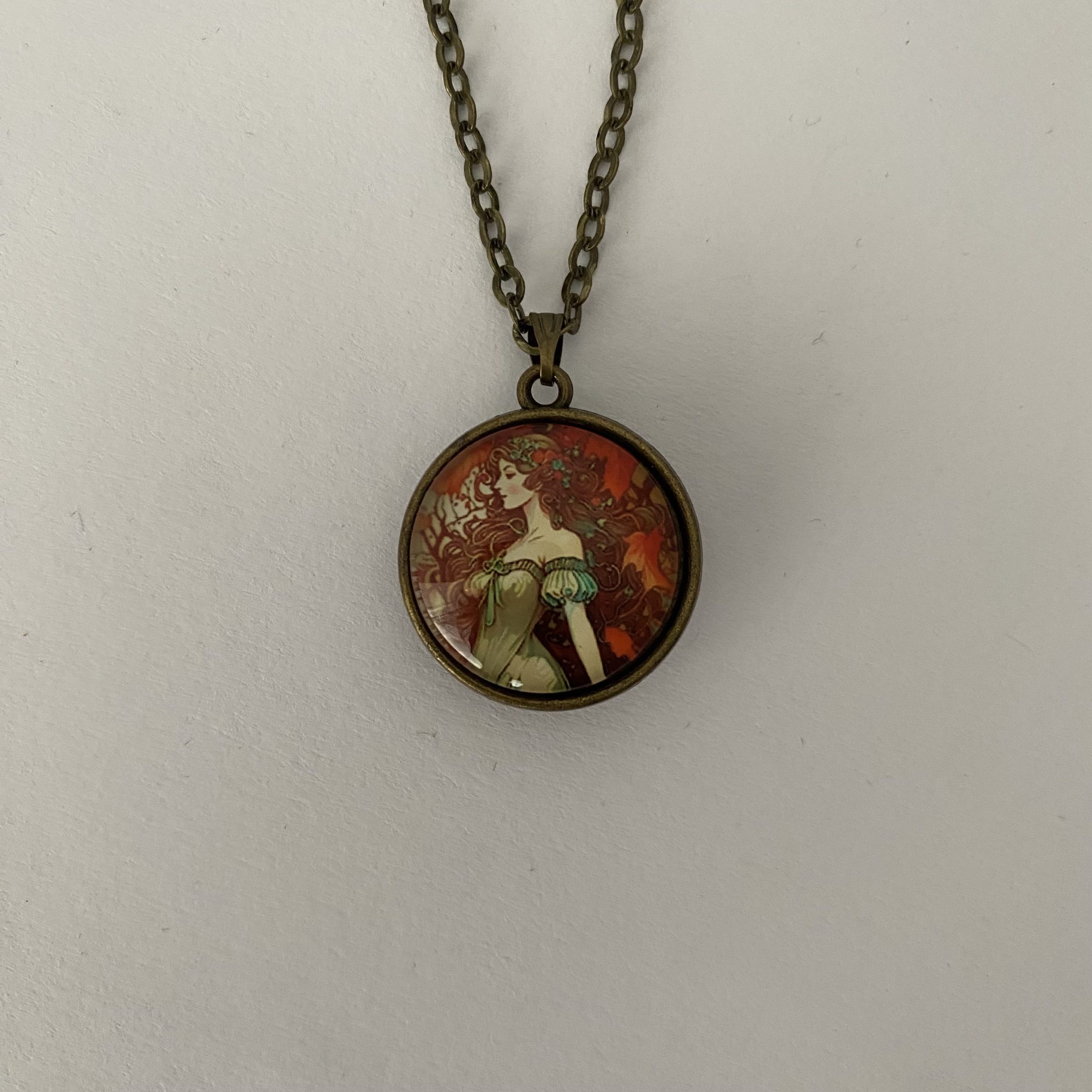 The warm tones of red, orange, and gold give the pendant a rich, antique-inspired appearance, perfectly complemented by the bronze-toned chain and setting. The delicate illustration and soft colours create a timeless piece that pairs beautifully with both casual outfits and more elegant styles. Ideal for lovers of vintage art, romantic designs, and unique handmade jewellery.