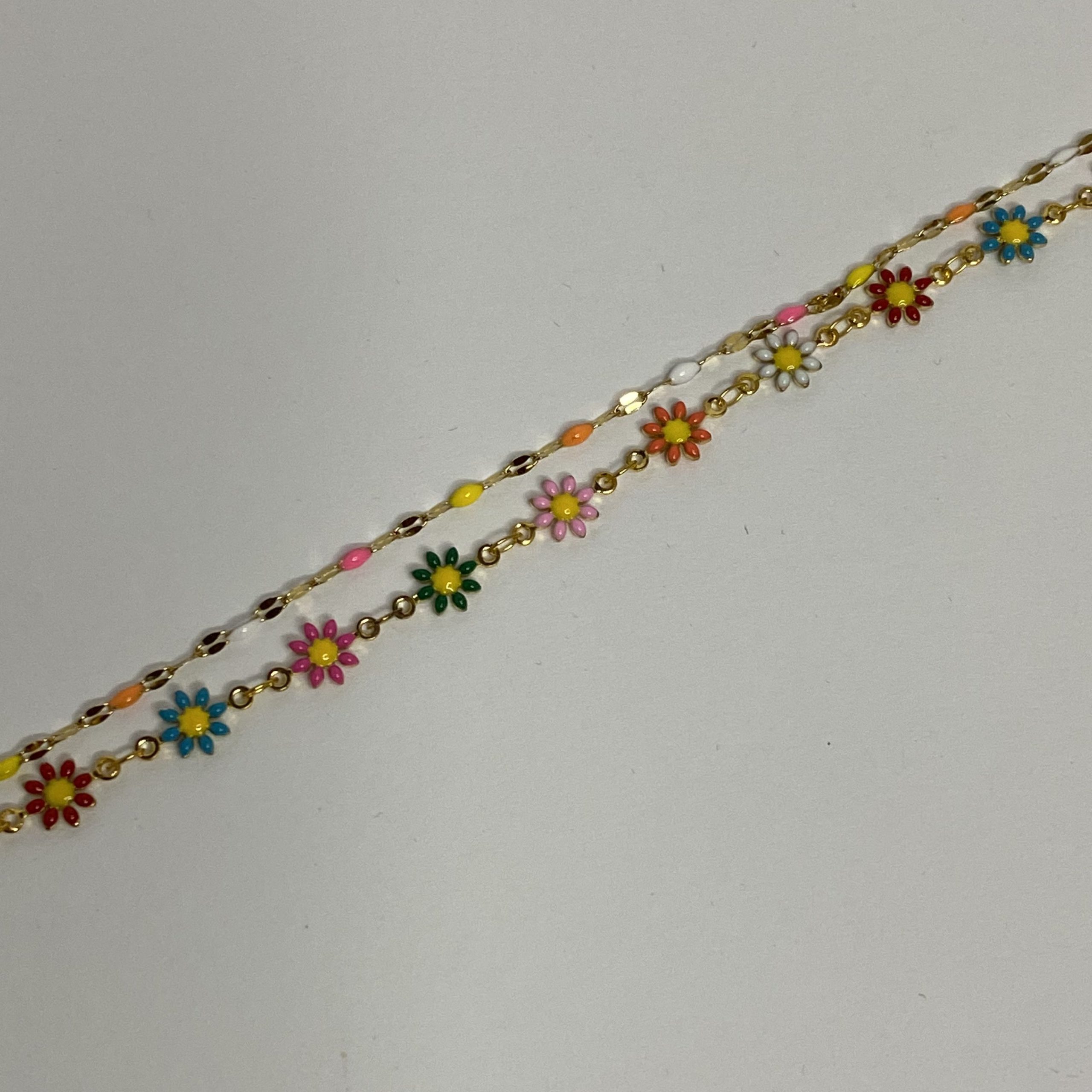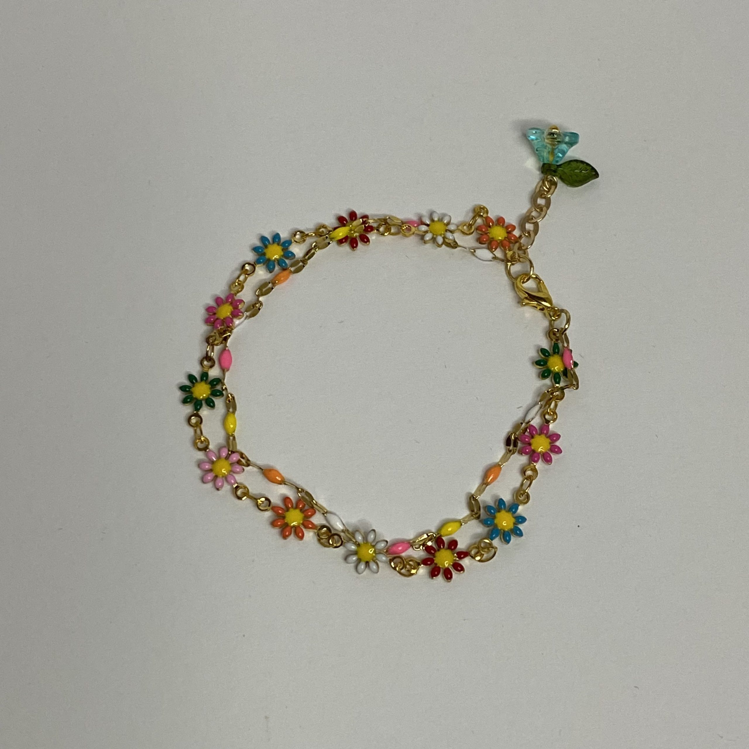 Add a pop of colour and character to your jewellery collection with this handmade colourful flower bracelet. Featuring a gold-toned chain adorned with colourful beads, this piece offers a delicate yet eye-catching look.