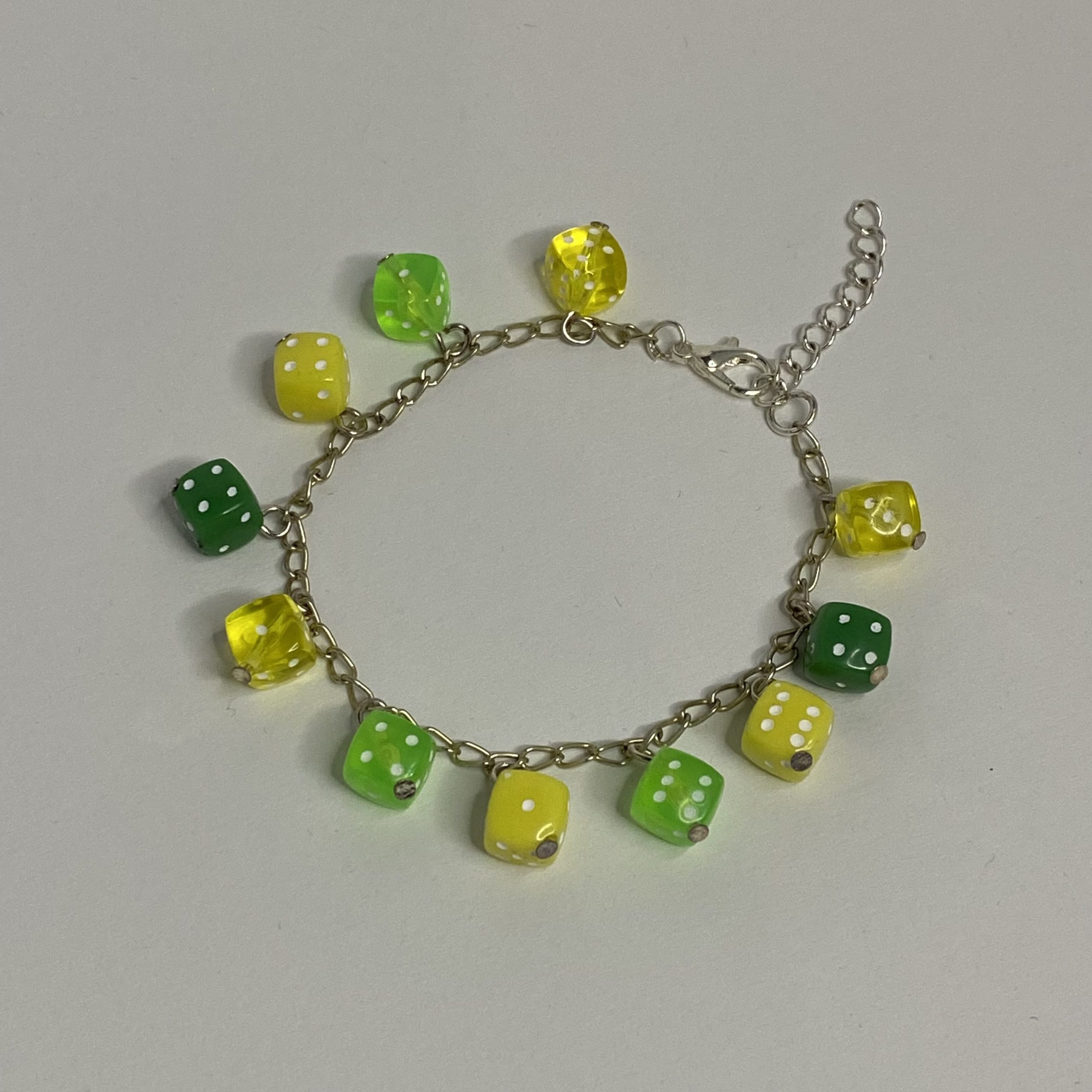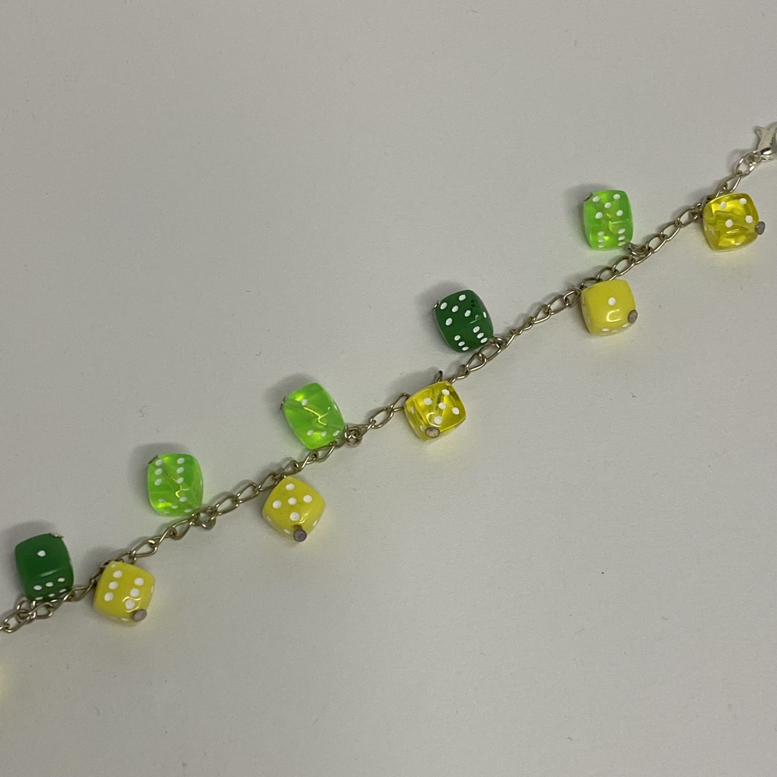 Add a pop of colour and character to your jewellery collection with this handmade dice bracelet with yellow/green accents. Featuring a silver-toned chain adorned with yellow and green dice, this piece offers an eye-catching look.