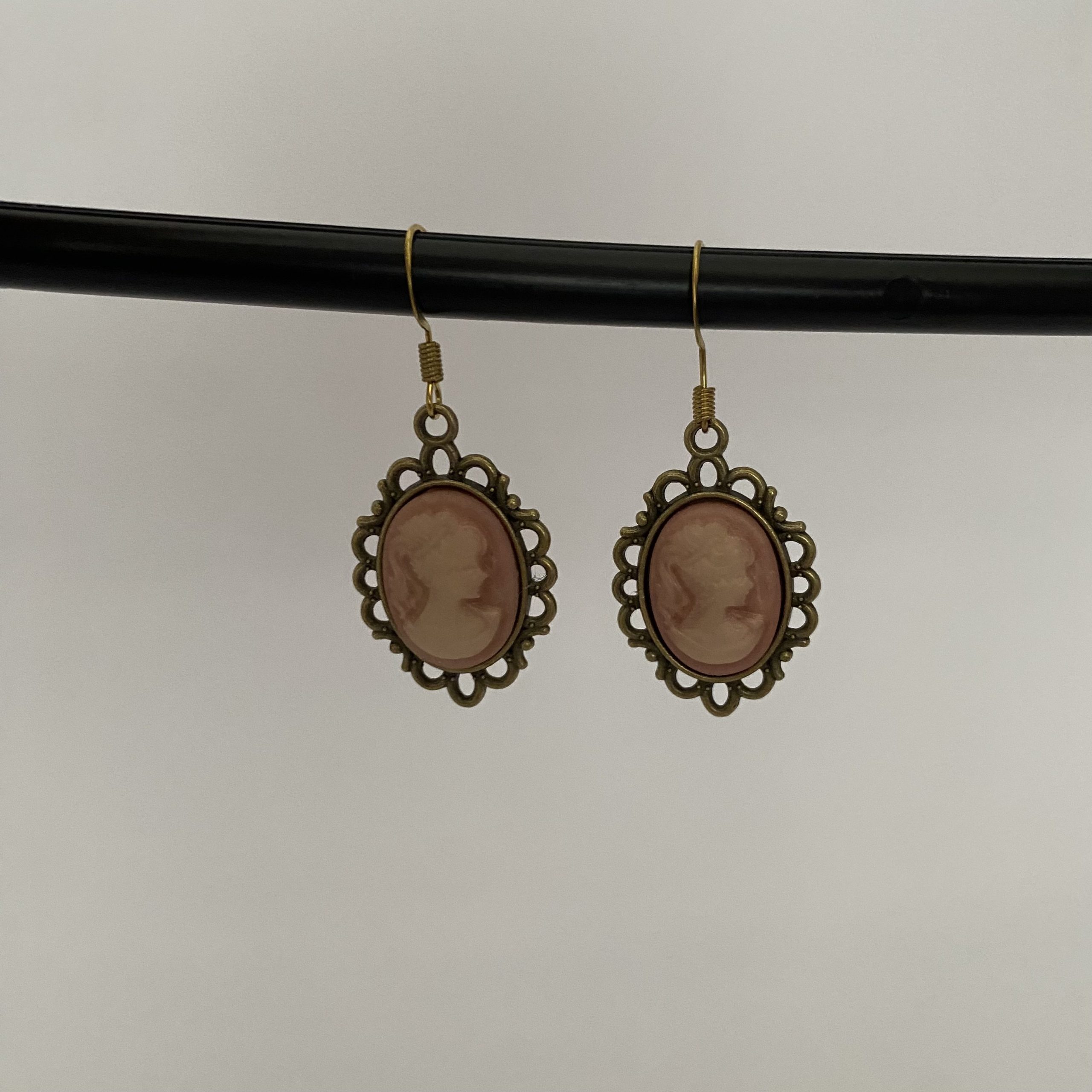 Bring timeless elegance to your accessory collection with these vintage-inspired pink cameo earrings. Featuring classic lady silhouettes in soft pink tones, set in intricate gold-toned frames, these earrings exude old-world charm with a touch of contemporary flair.