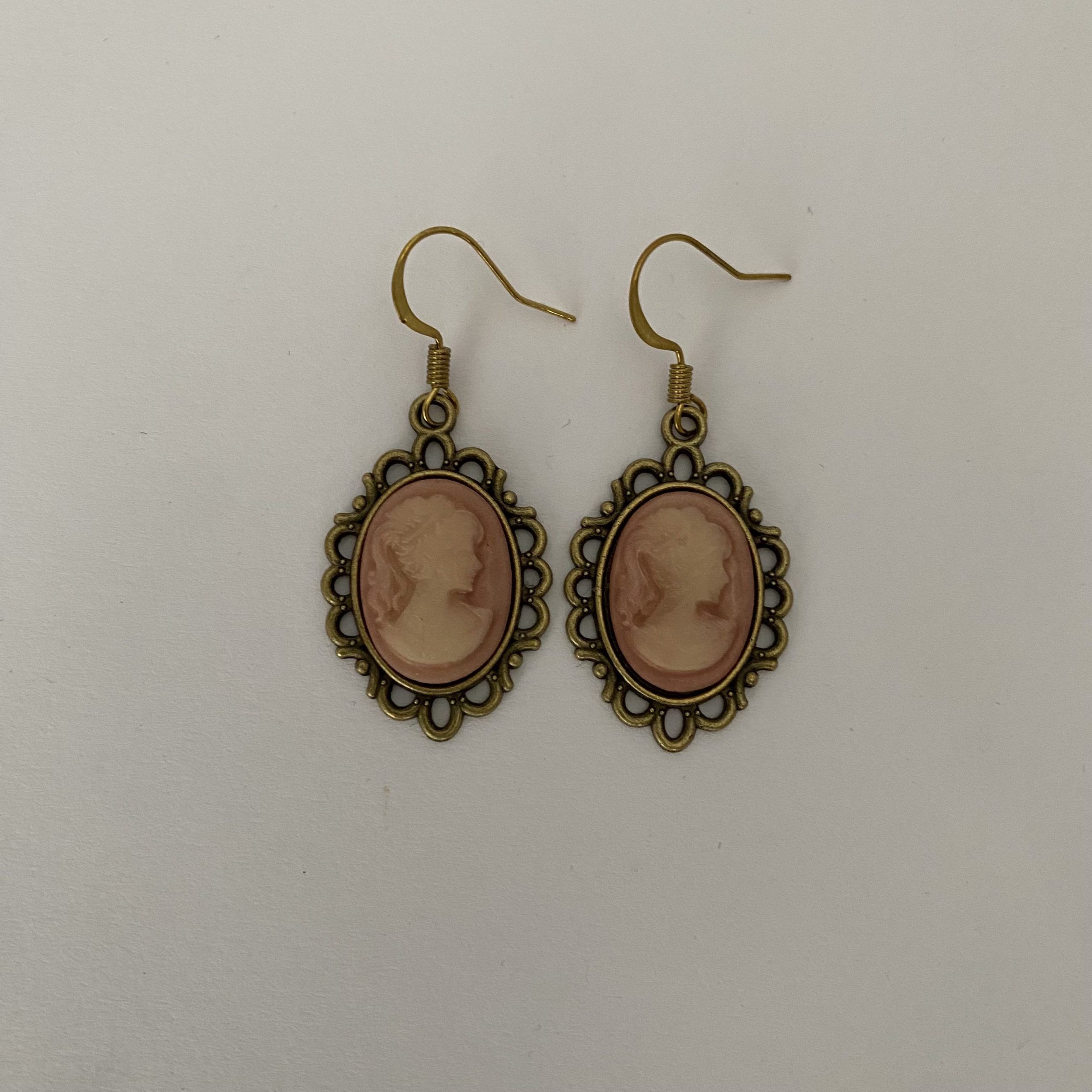 Materials: Resin cameos, gold-toned metal hooks and frames