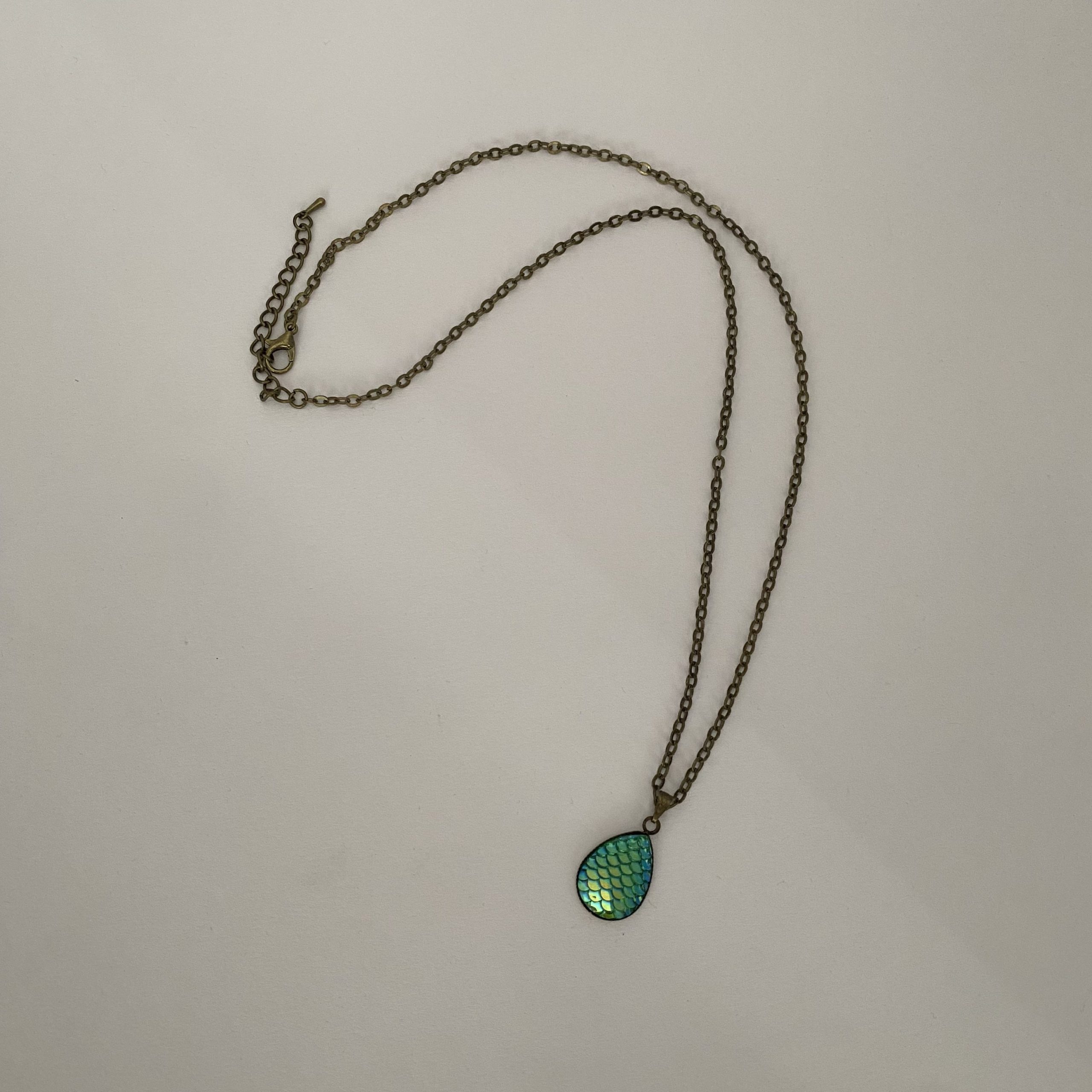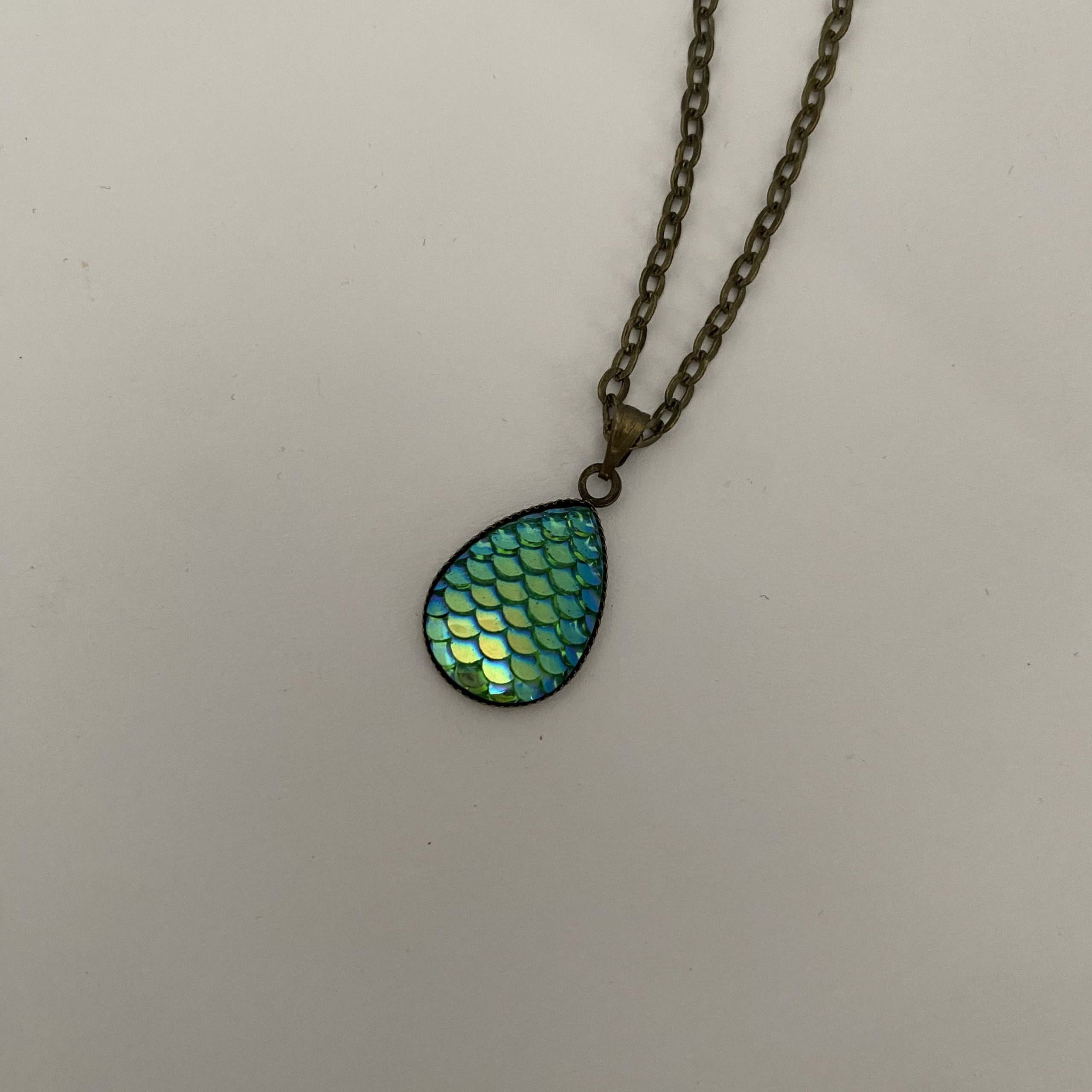 Add a touch of ocean magic to your jewellery collection with this enchanting turquoise mermaid scale necklace. The teardrop-shaped pendant features shimmering scales in beautiful turquoise and green tones that catch the light with every movement, reminiscent of a mermaid’s tail beneath the waves.